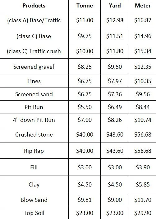 *Prices include loading and all weights are scaled and billed out per tonne. Yard and meter prices are for reference only and may vary depending on moisture and other factors. Taxes are charged above listed price. All prices are subject to change without notice due to fuel prices. Any testing of materials is the responsibility of the customer or done at an additional charge.